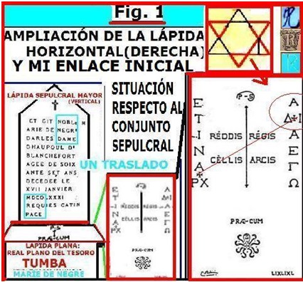 Volviendo al plano del "tesoro" en su fase final. Fue en vano porque ya habían sido copiados todos los escritos sobre las lápidas del cementerio anexo a su iglesia de Rennes-le-Château por unos excursionistas. Aunque no constan en la dicha lápida el aspa sobre la línea divisoria que es la linea vertical central, la existencia del diseño del "Anillo de Moisés" en ella es subliminal. En las ilustraciones de mi página titulada: "EL ANILLO DE MOISÉS DESCIFRADO", mostré cómo los cistercienses medievales adaptaron el dibujo del "Anillo de Moisés" a un jeroglífico. Lo hospedé en BLOGGER.COM (de GOOGLE.COM).