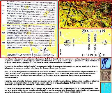 EL PLANO DE UN TESORO DE RELIGIÓNEn estas cuatro fotos, empezando el análisis por la figura inferior derecha, se trata de la lápida donde se lee, en idioma griego, lo que el sacerdote Berénguer Saunière inútilmente borró con mucho esfuerzo durante la noche. Tanta precaución me hace dudar de la noticia sobre Berénguer Saunière escrita -dicen- por él mismo años después: " La Resurrección de Jesús fue una broma; fue María Magdalena la que sacó el cuerpo de su tumba. Sus discípulos lo encubrieron con la mentira. Más tarde fue encontrado por los templarios y escondido tres veces. La tumba está aquí (Rennés-le-Château). Algunas partes de su cuerpo están a salvo. (...) Los enemigos no son lo herejes sino la Iglesia de Roma. He abandonado mi falsa Iglesia. He renunciado. He preservado el secreto.".