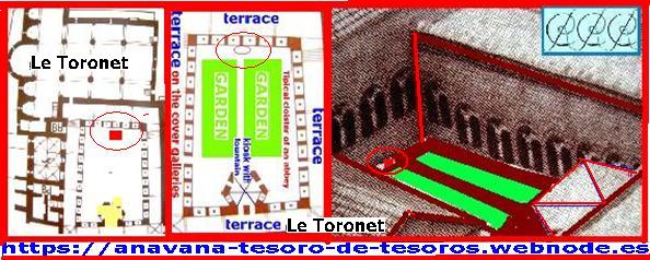 Pasé varios veranos meditando, sentado bajo el quiosco hexagonal de un claustro, edificado por la orden del Cister. Para solucionarlo, me imaginaba que yo era el "JUGADOR BUENO", de una partida de ajedrez, tal como me indicaban las pistas que dicho párroco dejó disimuladas en su iglesia. El "Jugador MALO", obviamente consideré que era una informe peña partida (como una isla dentro de un jardín), que aflora en el otro extremo del ajardinado claustro. Está ubicado en el lado opuesto a la fuente hexagonal, o lavabo de los monjes, a su vez cubierto con un tejado hexagonal. Después de mucho tiempo, y de muchos esfuerzos en vano, al fin pude sospechar que tal vez, el JUGADOR MALO, pudiese ser yo mismo. De modo que, me puse de pie sobre la peña viva, y con toda la humildad del mundo, yo tan sólo tuve que persignarme una vez mas. En efecto, la posición de mi mano me indico el lugar donde la sombra de dos cipreses, en determinado período, indicaba dónde había estado oculto el tesoro de Berénguer Saunière. El la terraza superior, existe un pegote en el rehecho muro, muy penosamente realizado con piedras pequeñas. Una vez alli, vi que estaba bastante elevado respecto al nivel del suelo de la terraza de la derecha.