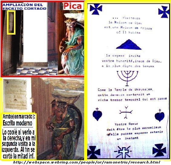 En estas cuatro fotos, empezando el análisis por la figura inferior derecha, se trata de la lápida donde se lee, en idioma griego, lo que el sacerdote Berénguer Saunière, muy inútilmente borró, durante la noche con mucho esfuerzo. Tanta precaución, me hace dudar de la noticia sobre Berénguer Saunière escrita -dicen- por él mismo años después: " La Resurrección de Jesús fue una broma; fue María Magdalena la que sacó el cuerpo de su tumba. Sus discípulos lo encubrieron con la mentira. Más tarde fue encontrado por los templarios y escondido tres veces. La tumba está aquí (Rennés-le-Château). Algunas partes de su cuerpo están a salvo. (...) Los enemigos no son lo herejes sino la Iglesia de Roma. He abandonado mi falsa Iglesia. He renunciado. He preservado el secreto.".