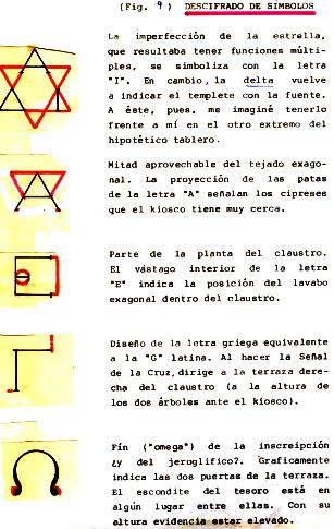 Pasé varios veranos meditando bajo el quiosco hexagonal de un claustro edificado por la orden del Cister. Para solucionarlo, me imaginaba que yo era el "Jugador Bueno" de una partida de ajedrez, tal como me indicaban las pistas que dicho párroco dejó disimuladas en su iglesia. El "Jugador Malo" consideré que era una informe peña (como una isla dentro de un jardín), que aflora en el otro extremo del ajardinado claustro. (Está en el lado opuesto a la fuente hexagonal, o lavabo de los monjes). Después, de pie sobre la peña viva, sólo tenía que persignarme, y la posición de la mano me indicaría el lugar donde la sombra de dos cipreses, en determinado período, indicaba dónde había estado oculto el tesoro de Berénguer Saunière. Detrás de un muro, muy penosamente rehecho con piedras pequeñas, que está un poco elevado respecto al suelo de la terraza de la derecha.